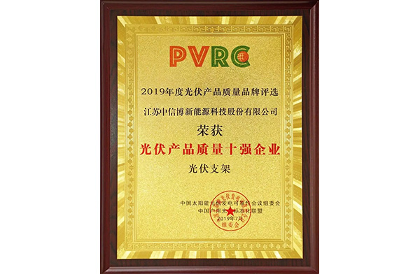 近日,由中国可再生能源学会主办的2019中国太阳能光伏发电技术可靠性研讨会(PVRC)在苏州举行,同期还举办了“光伏产品质量十强企业”评选颁奖活动,中信博荣获“光伏支架产品质量十强企业”称号。